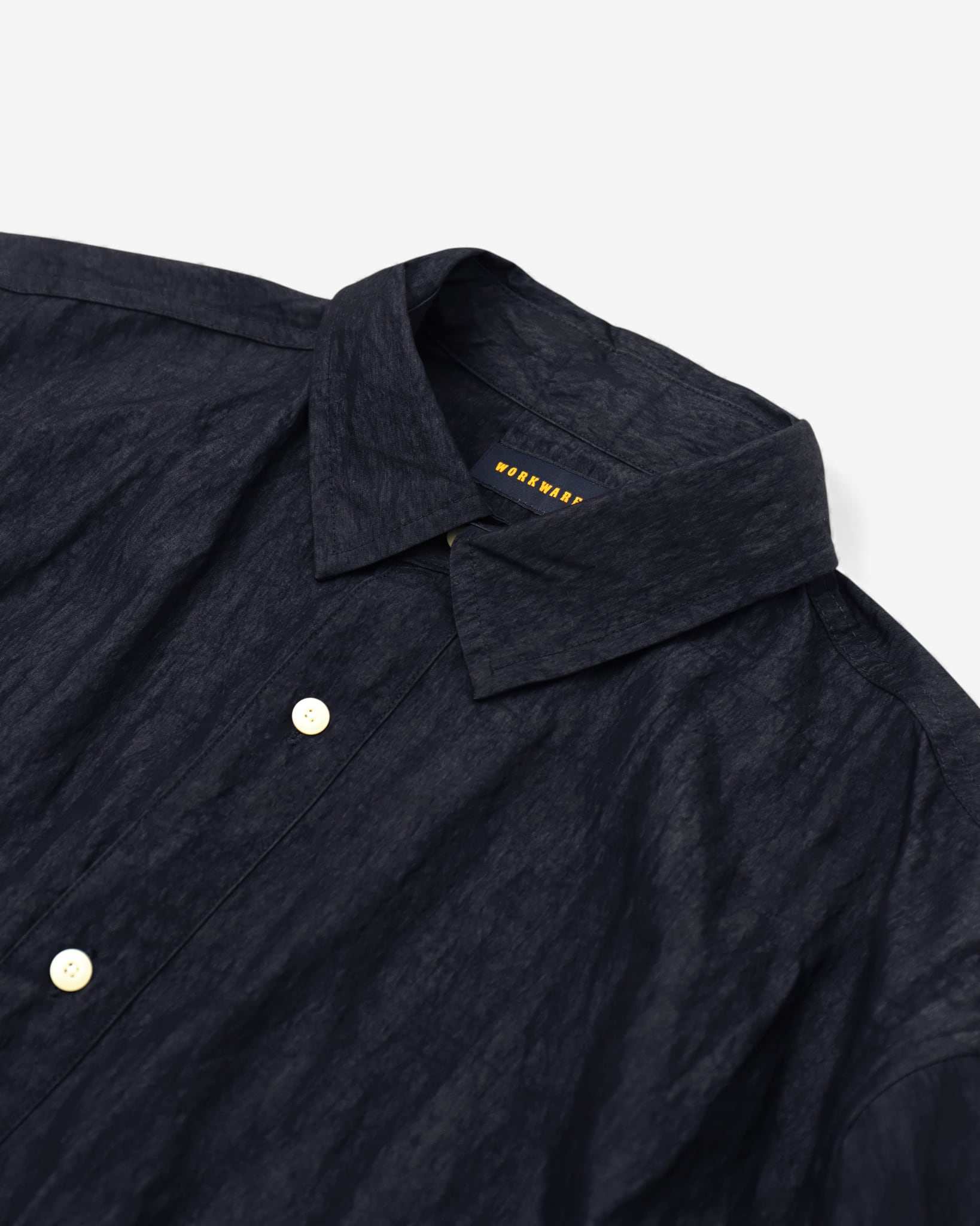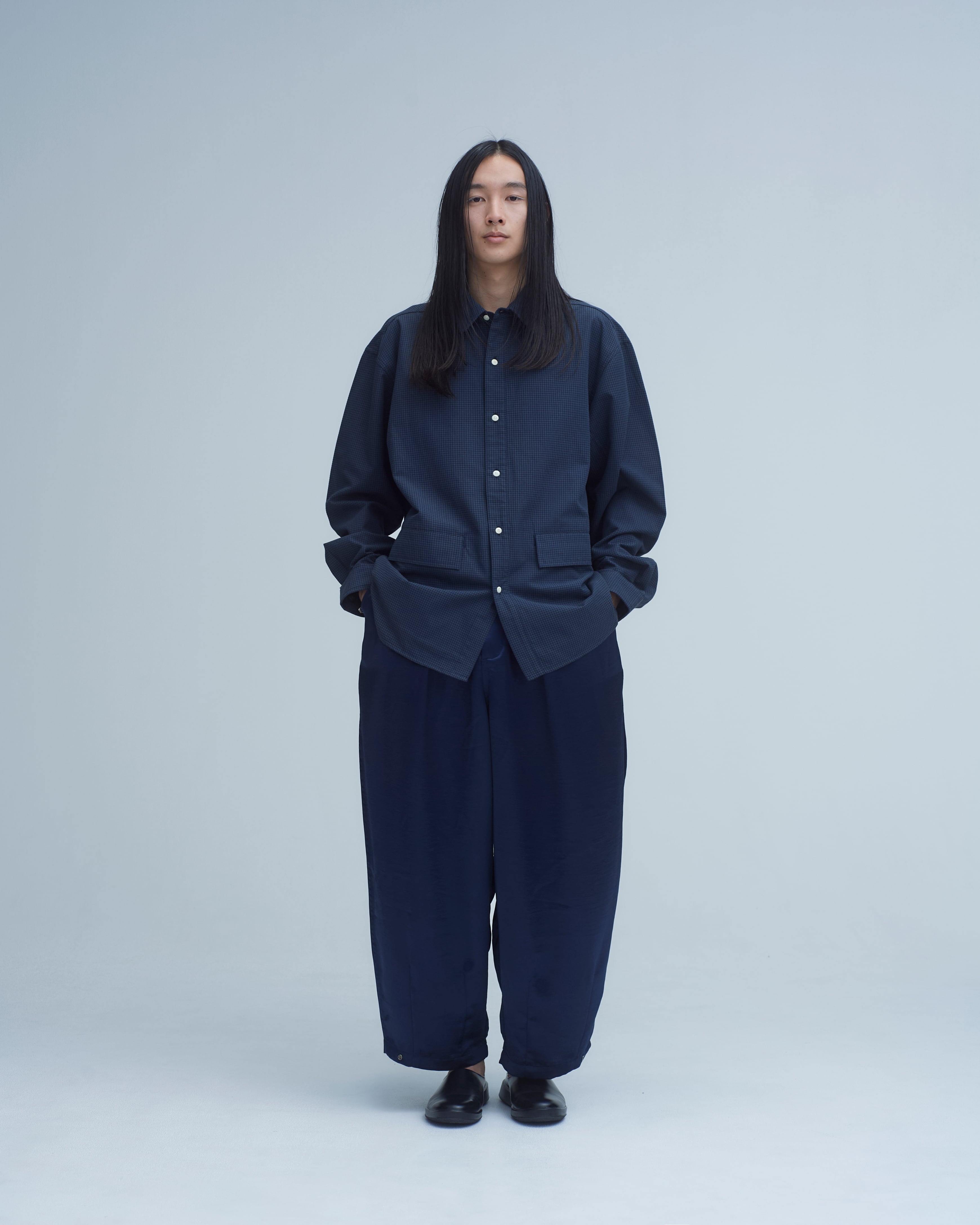 建築的なフォルムの中に実用性を統合した、彫刻的な佇まい。たっぷりと取られた空間が、日常の動作に軽やかなドレープと静かな余白をもたらす。shared wardrobe における、洗練された快適さの追求。