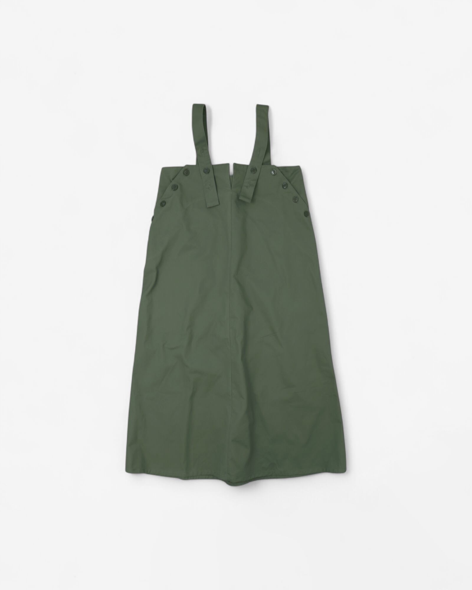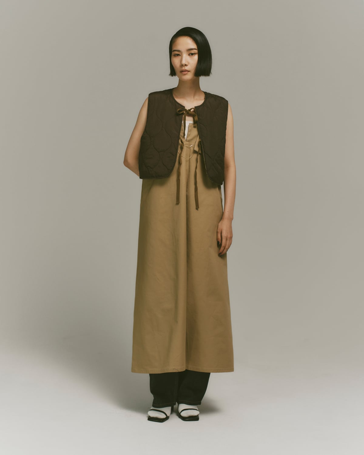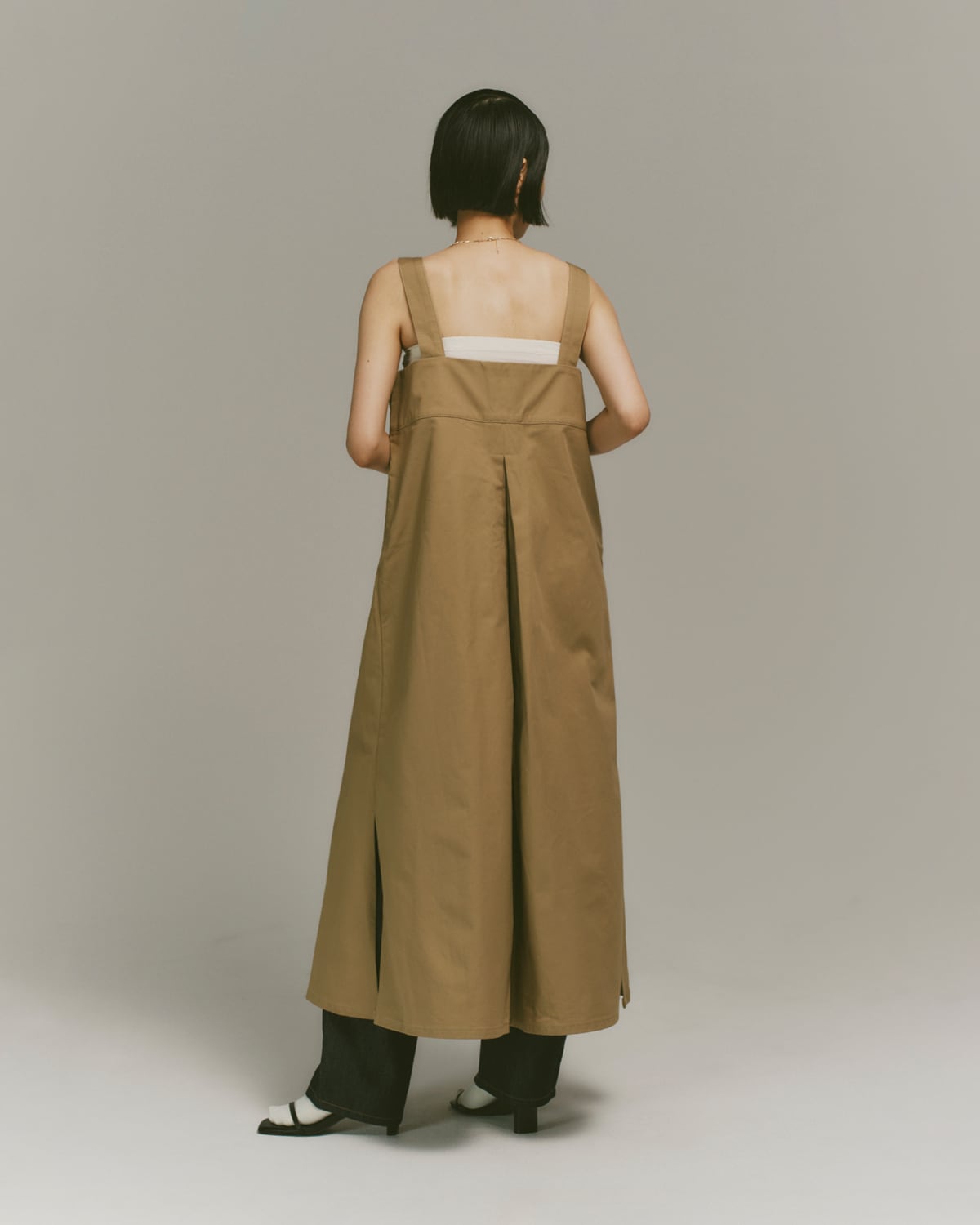 アトリエのエプロンを、ドレスとして再構築。幅広のビブが胸元に広がり、両サイドをボタンで留める構造。その下は、アンストラクチャーなボリュームが足首まで落ちる。ブラの上に直接着ても、Tシャツに重ねても成立する。上にジャケットを羽織れば、スカートとして機能する。バックはセンタープリーツが深く入り、ヘムに動きをつくる。