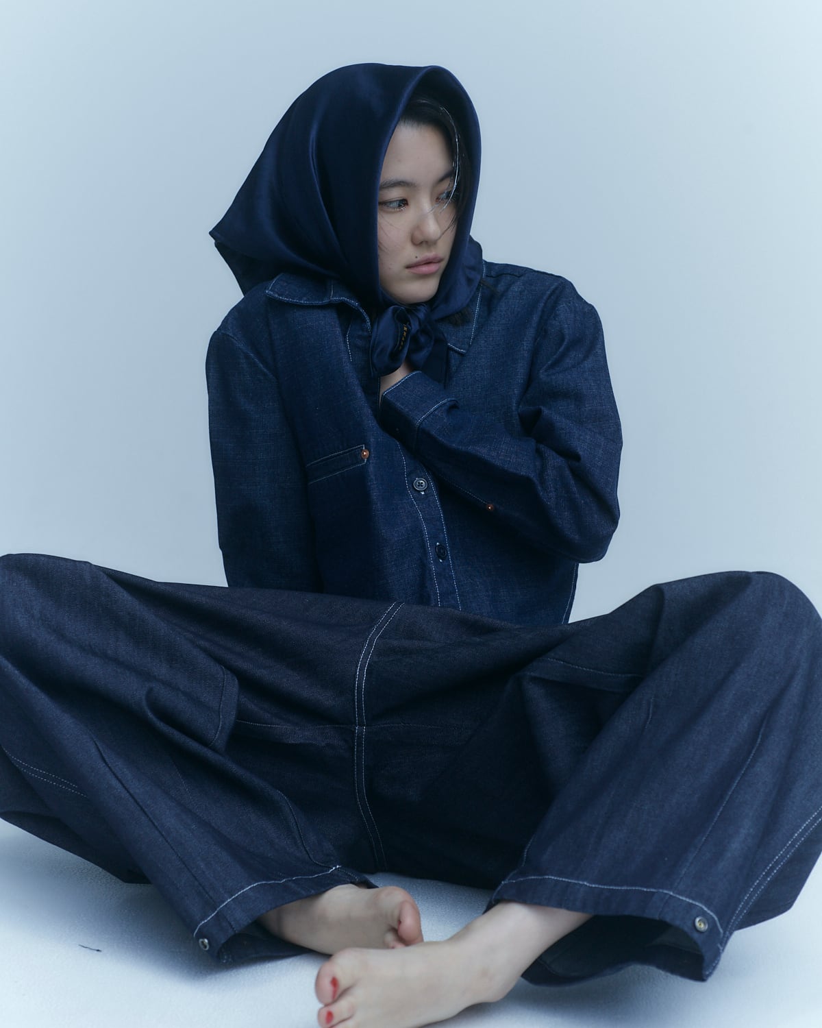 彫刻的なボリュームが描く、流動的なシルエット。ドライで重厚な手触りが、身体の動作を建築的に定義する。shared wardrobe における象徴的なジェスチャー。