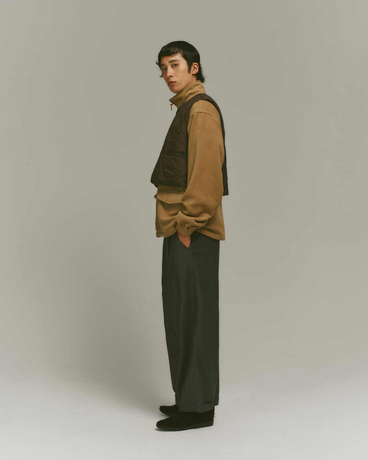 日常の shared wardrobe における多目的な土台として、端正なドレープを伴う直線的なボリュームを表現。日々の仕草に寄り添う、静かな余白を感じさせるフォルム。