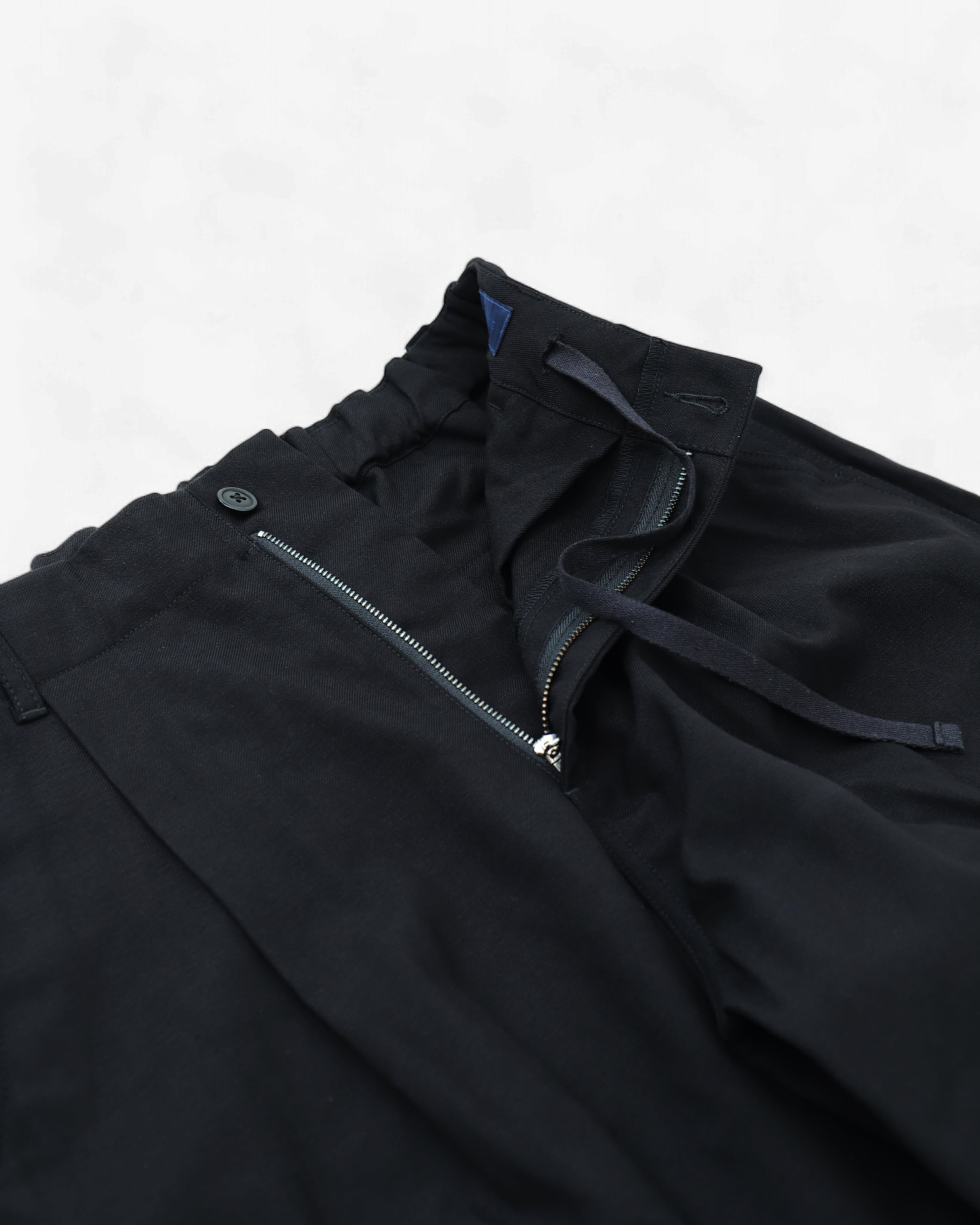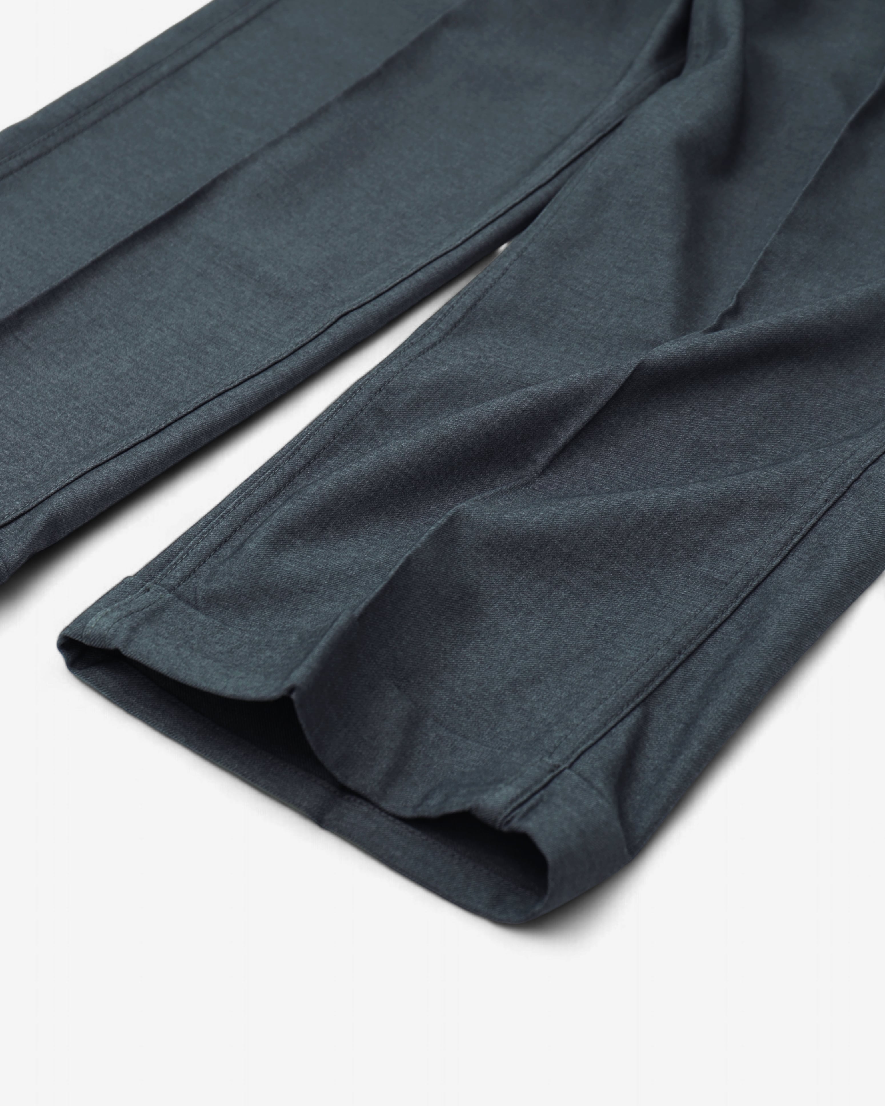 日常の shared wardrobe における多目的な土台として、端正なドレープを伴う直線的なボリュームを表現。日々の仕草に寄り添う、静かな余白を感じさせるフォルム。