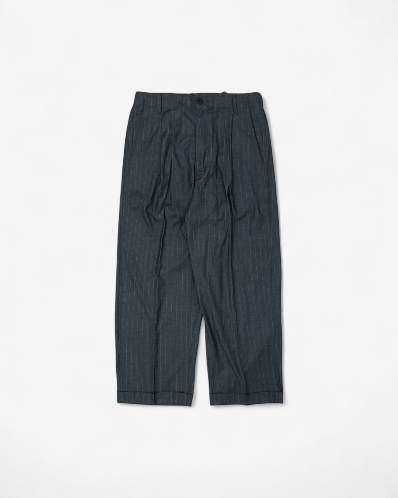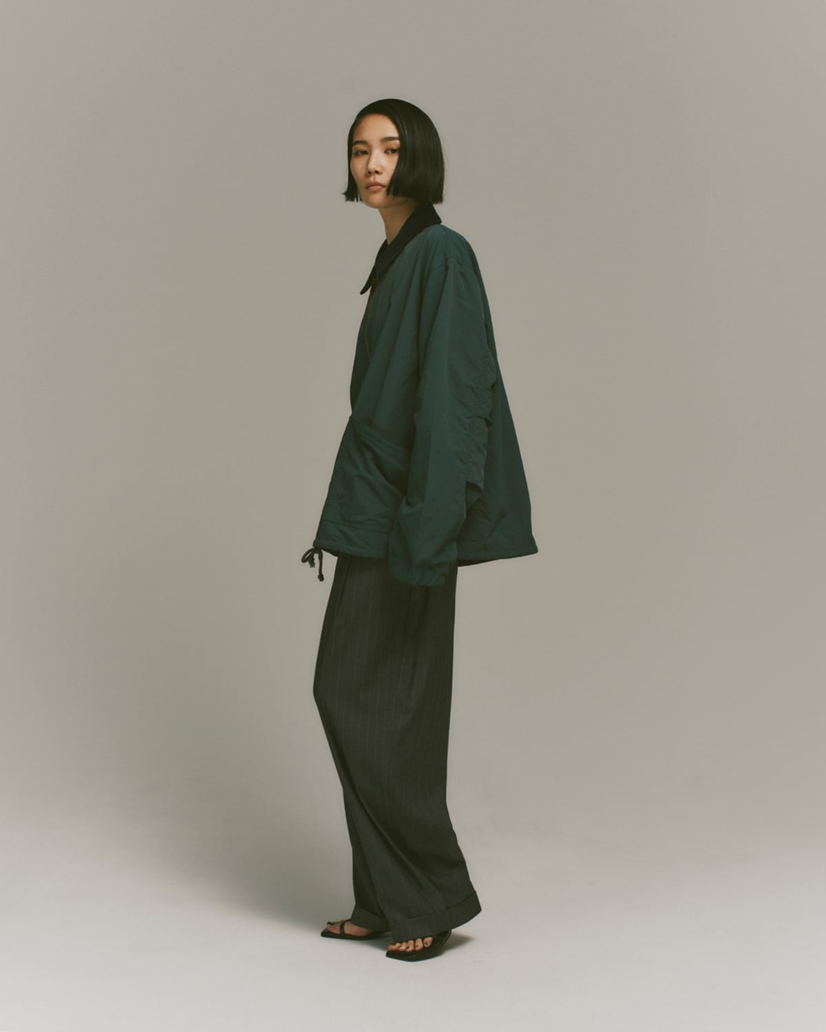 日常の shared wardrobe における多目的な土台として、端正なドレープを伴う直線的なボリュームを表現。日々の仕草に寄り添う、静かな余白を感じさせるフォルム。