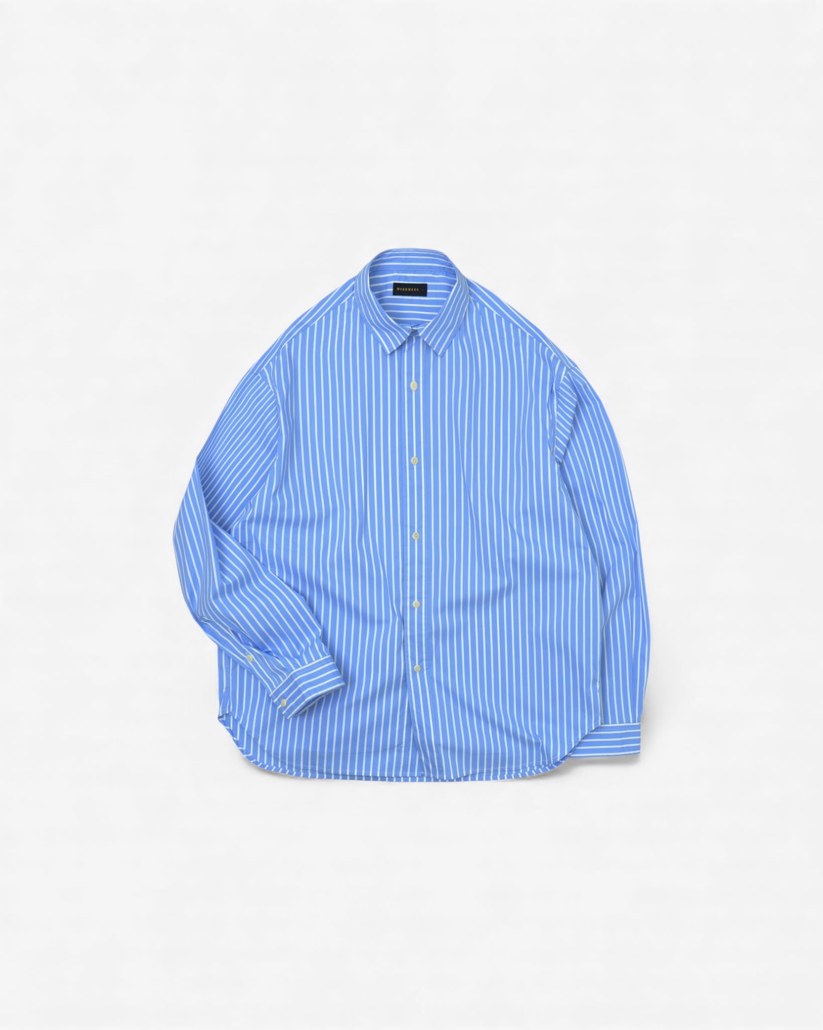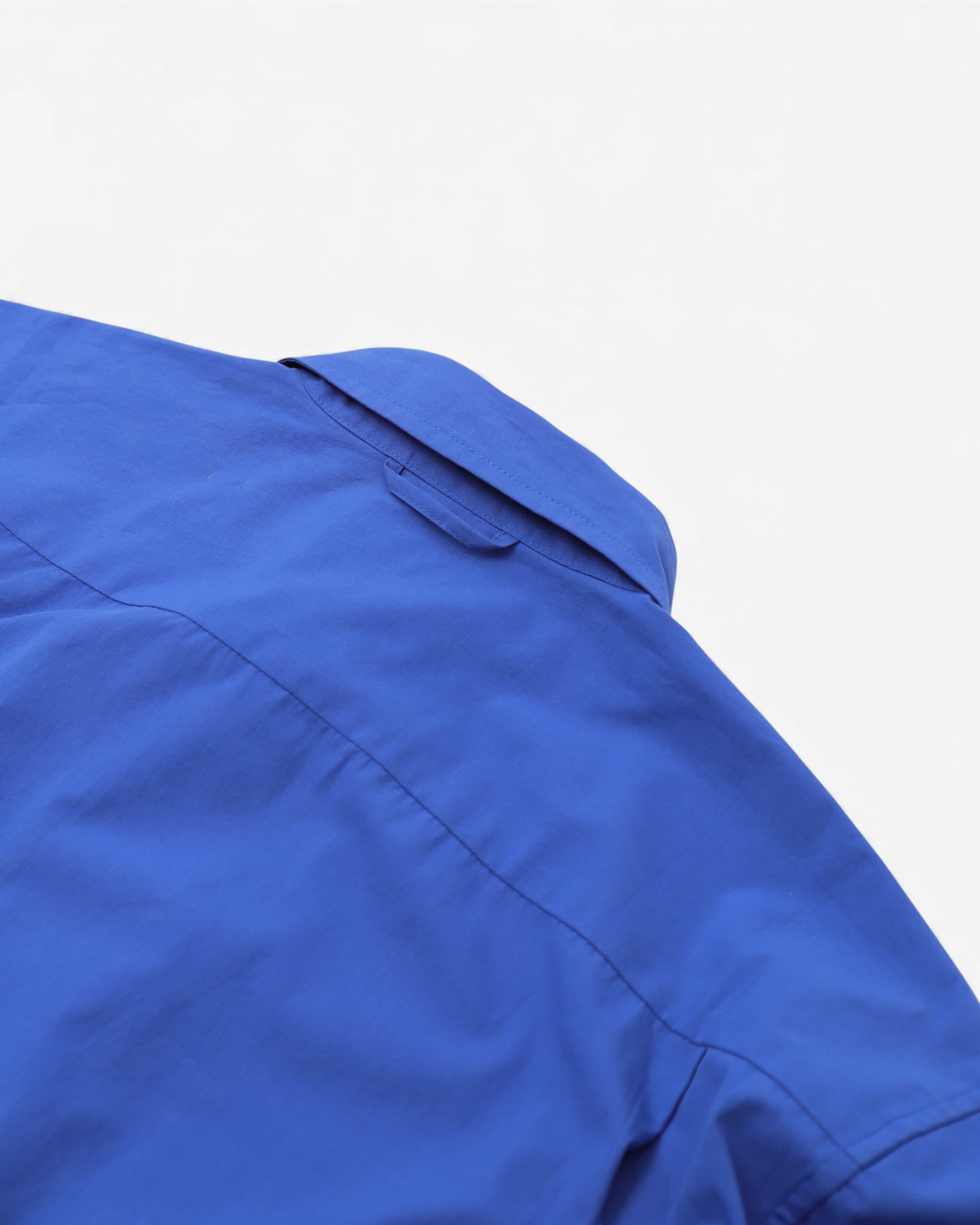 アメリカのオックスフォードシャツを、クリーンなボックスに再構築。シェイプなしでトルソーから離れて落ち、ショルダーはドロップ、ヘムはサイドでゆるやかにカーブ。ポケットはサイドシームに縫い込まれ、フロントからは見えず、スマートフォンやサングラスが収まる深さ。一つのワードローブに、二人で着る — 同じシャツが、一方の体には長く落ち、もう一方にはライトジャケットとして読まれる。