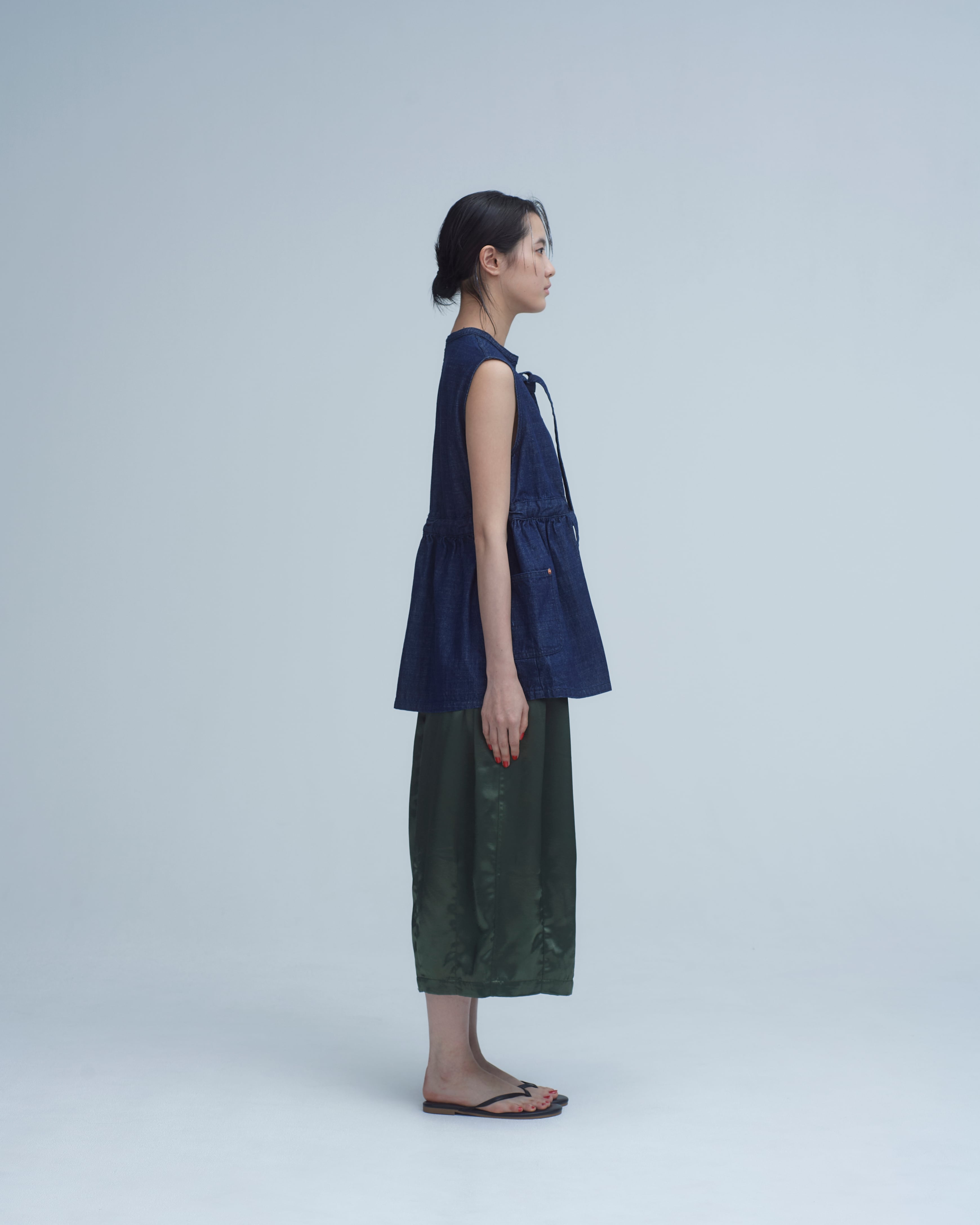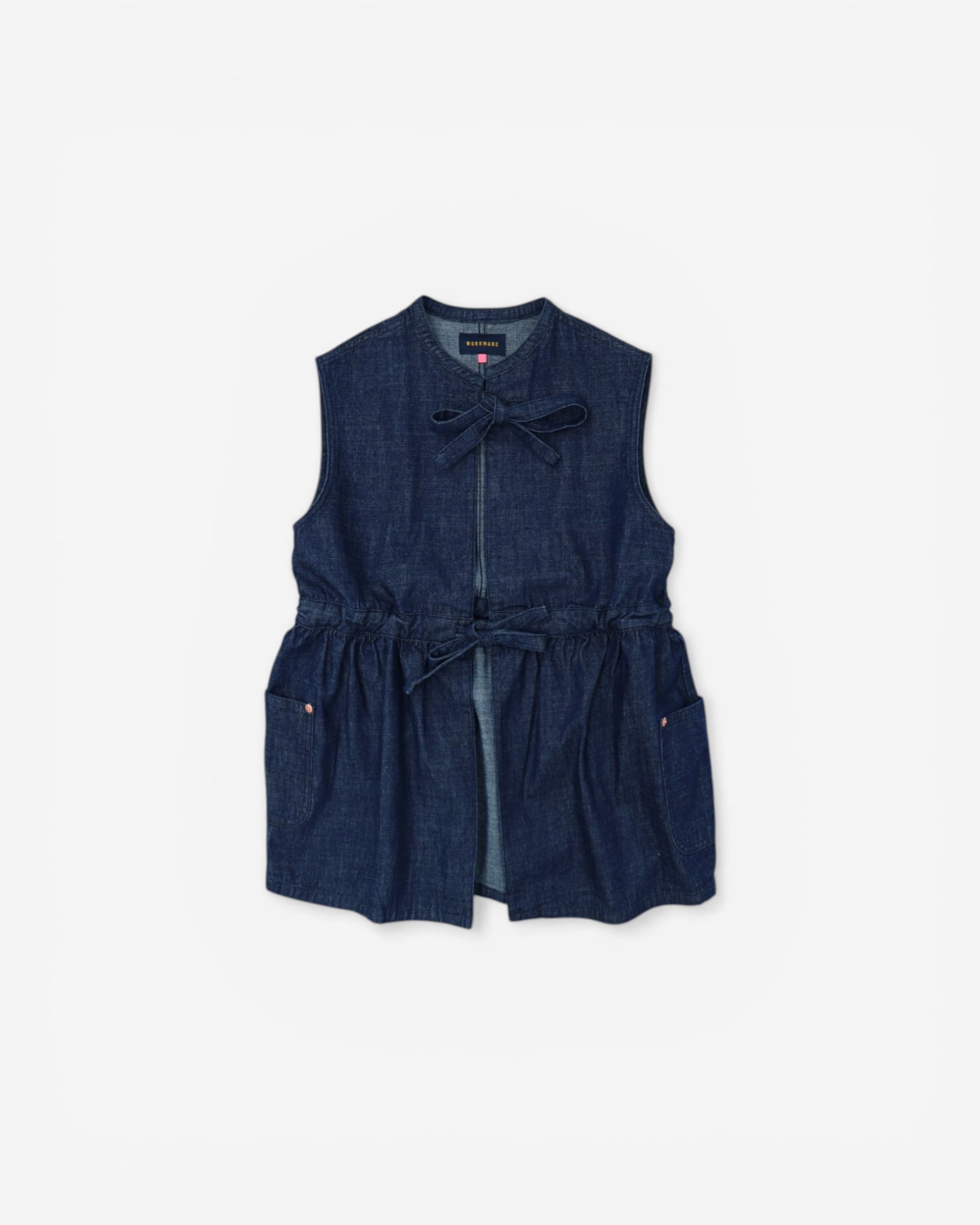 ヴィンテージのフライトベストから着想を得た、気品ある建築的レイヤー。ドライで構造的な質感と、控えめな紋様が、ボリュームのあるジェスチャーを描き出す。身体の動きに優雅に呼応しながら、日常の装いに確かな存在感をもたらすシルエット。