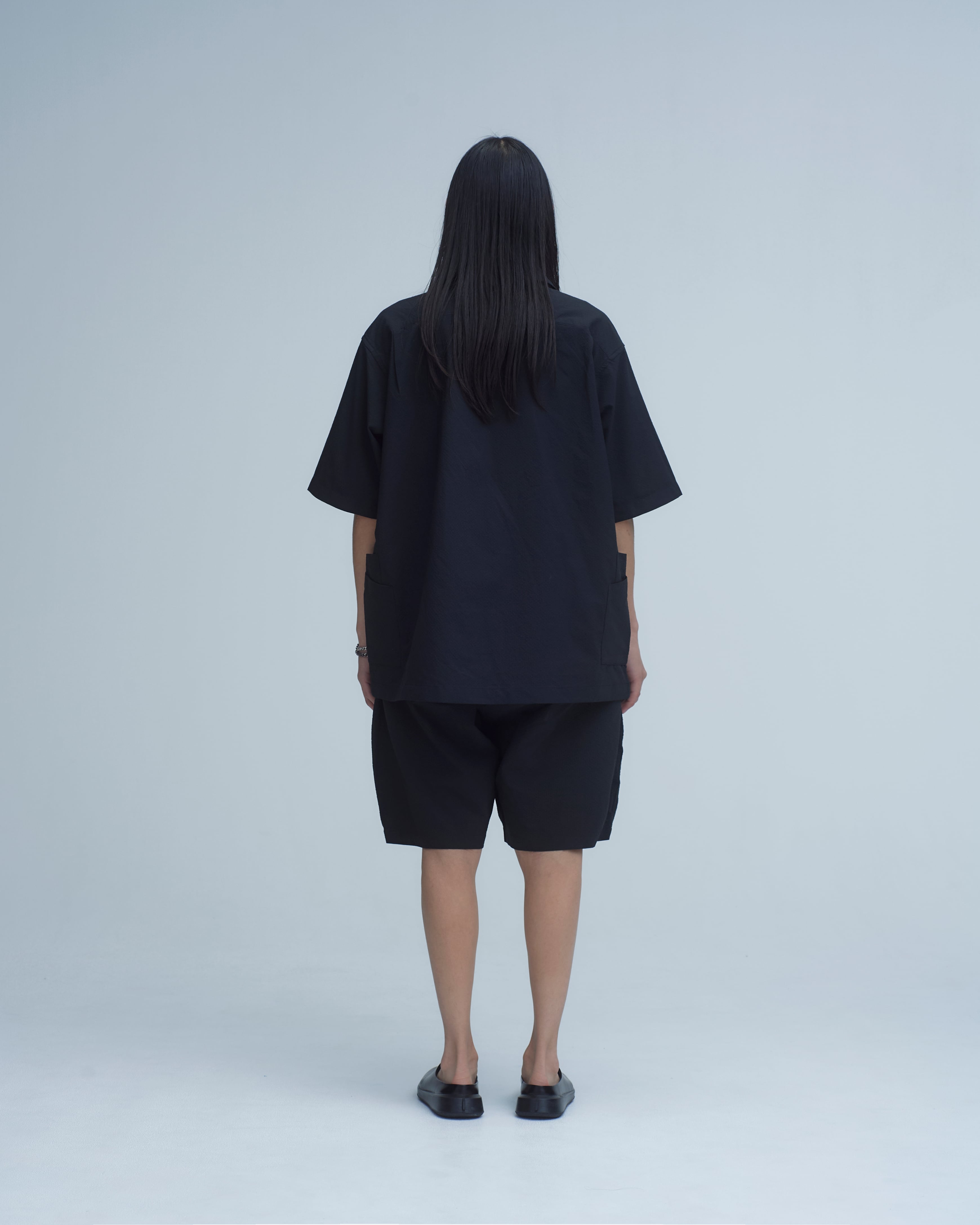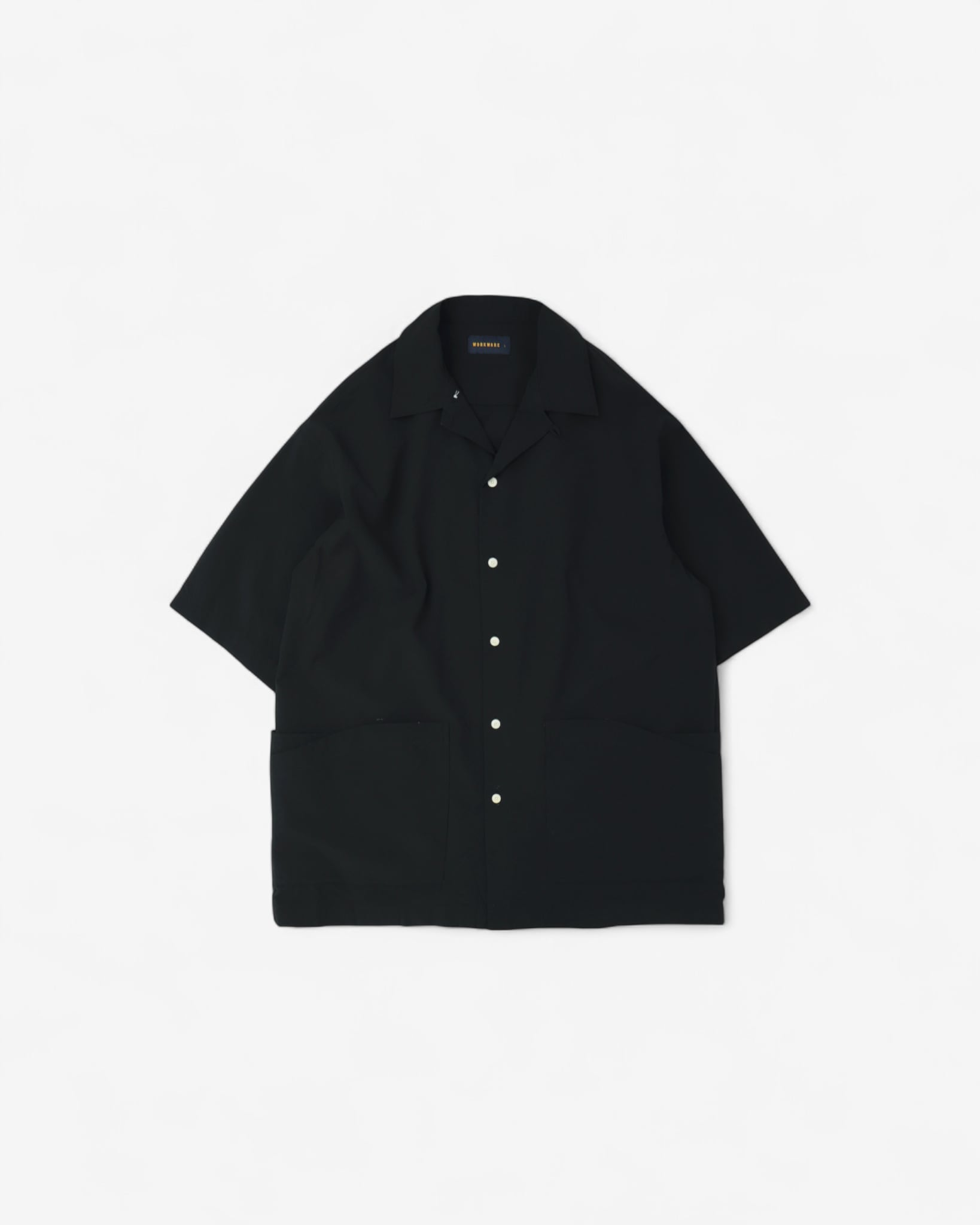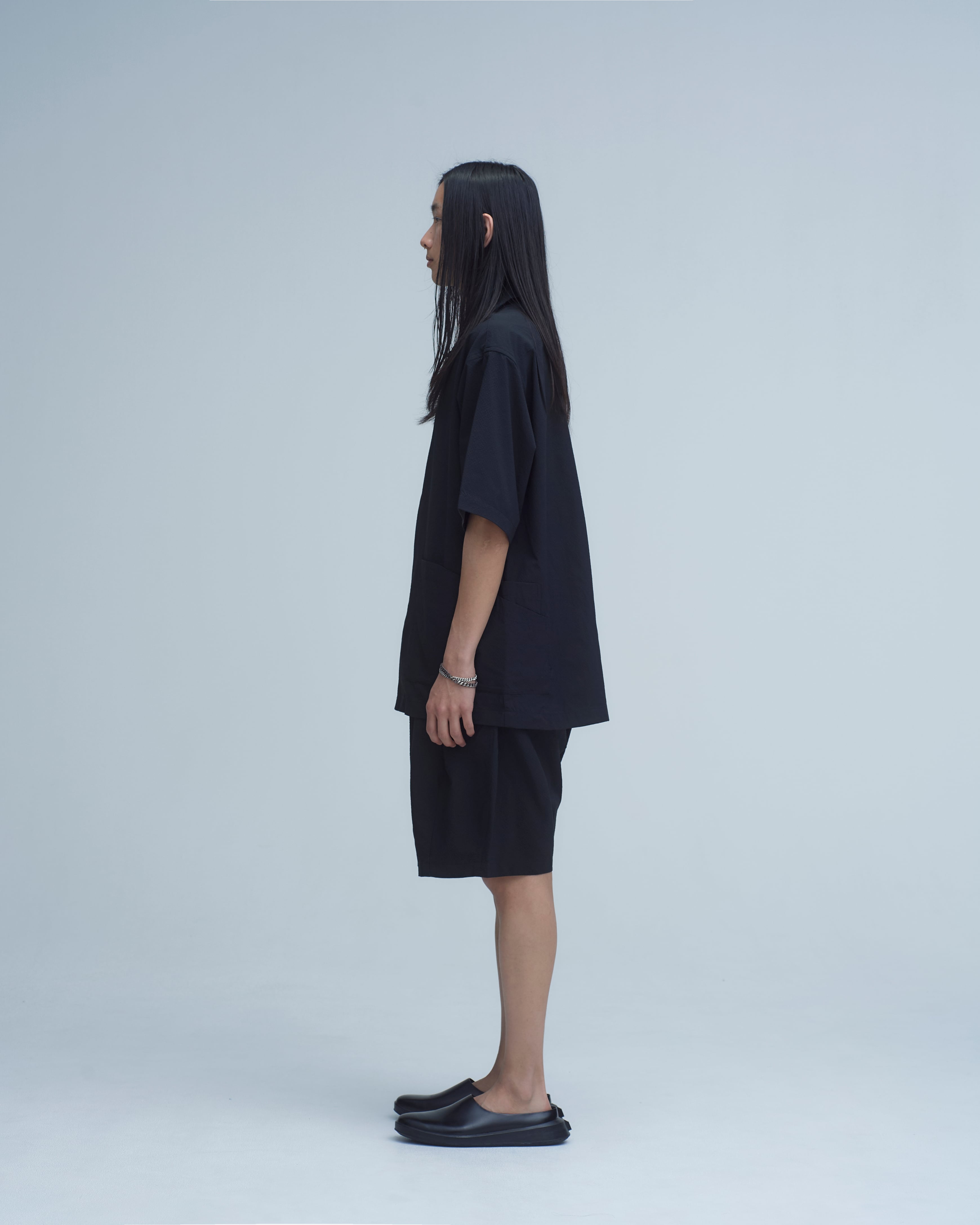 ボックスシルエットの半袖シャツ。開襟カラーが平らに寝て、ウエスト位置に大きめのパッチポケットが2つ。シアサッカーコットンが生地を肌から浮かせ、空気の通り道を作る——ボリュームがあっても、着ていて涼しい。