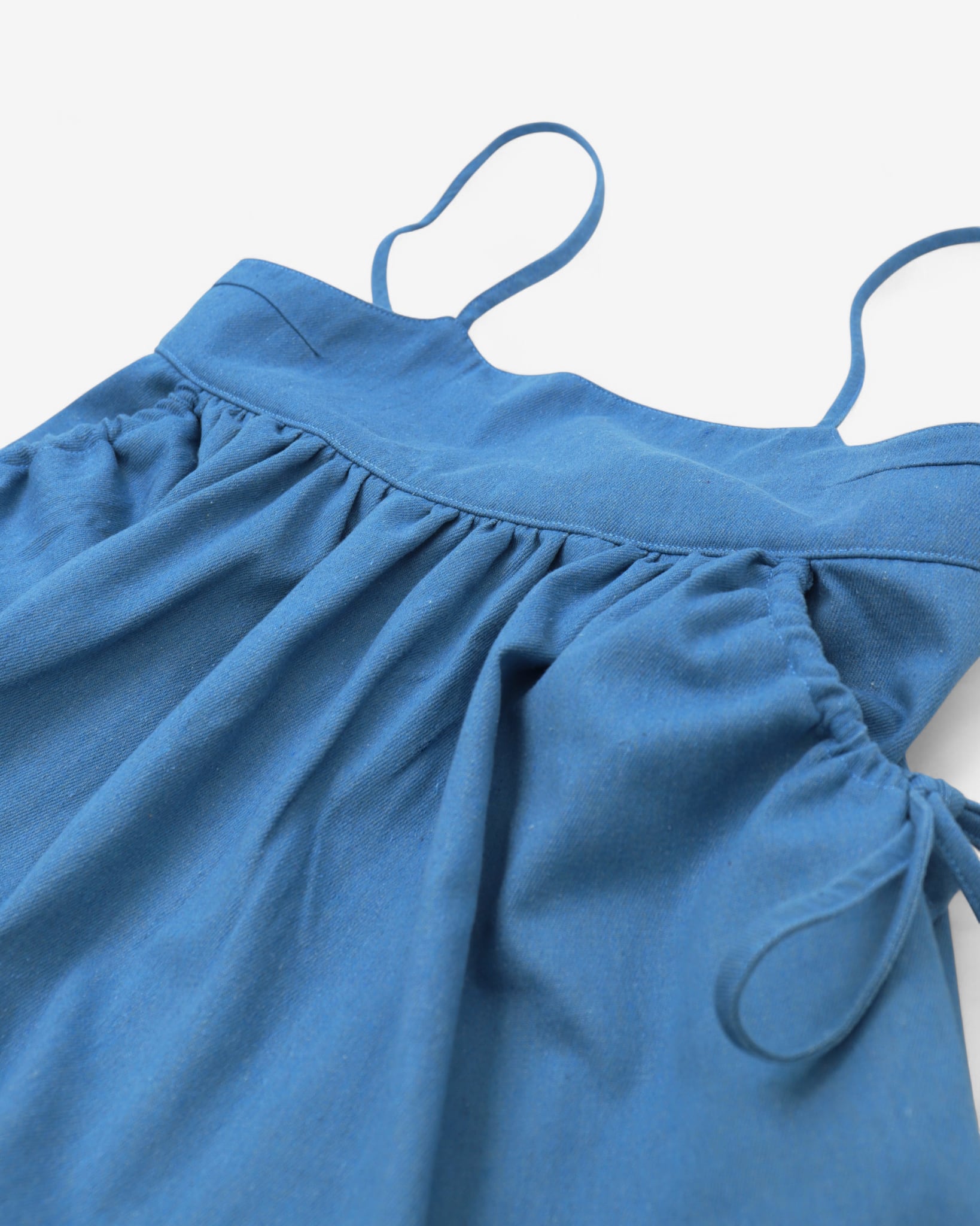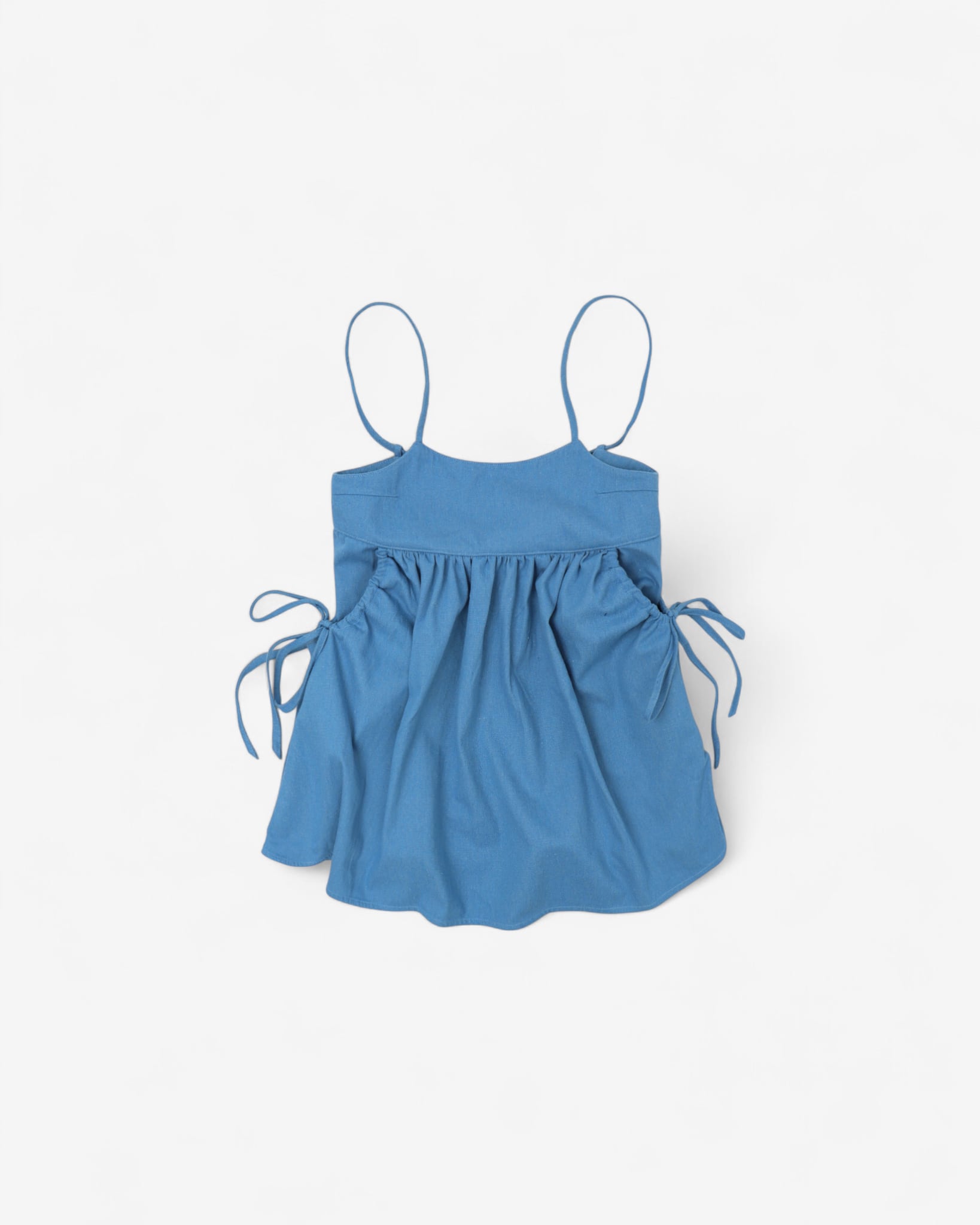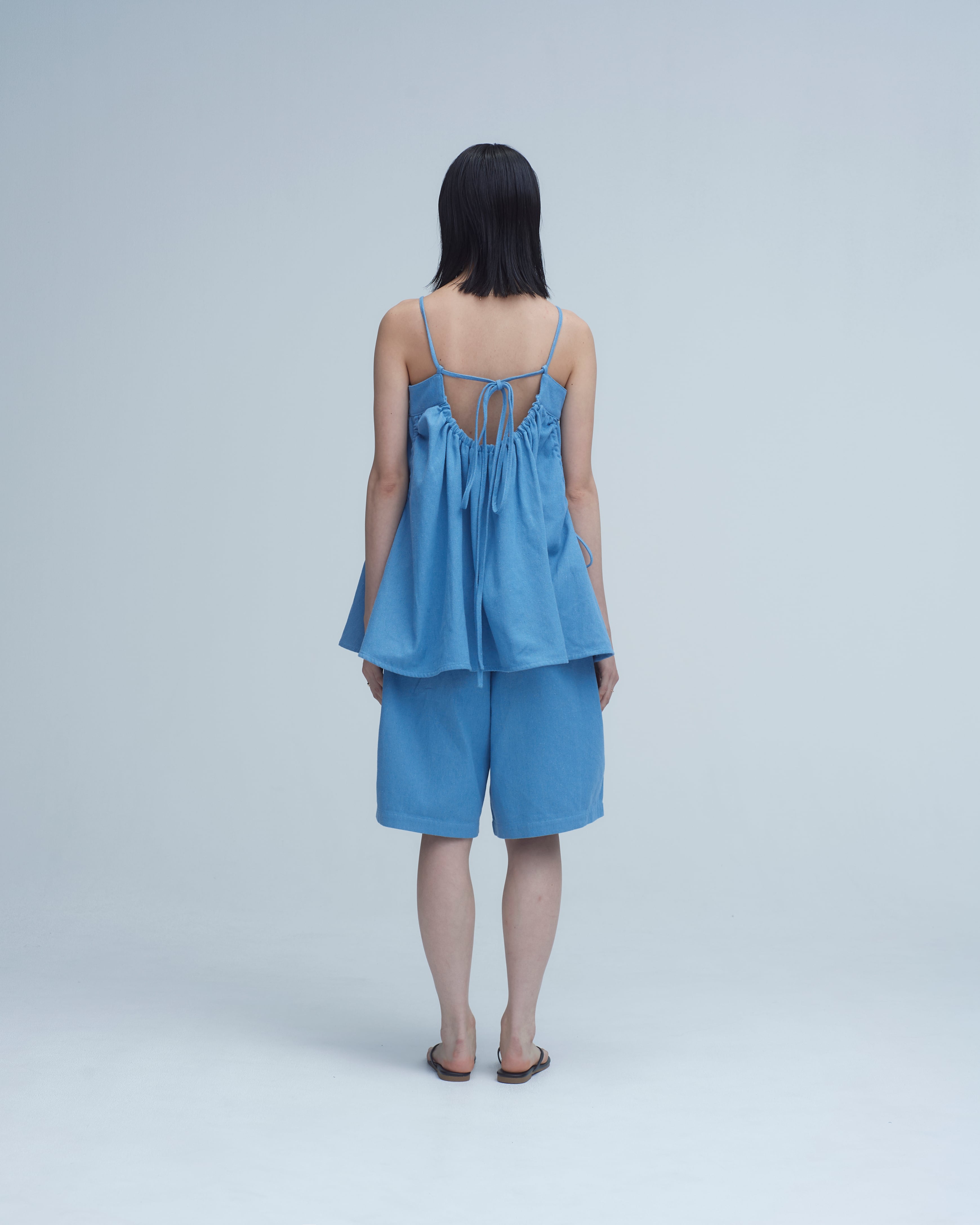 ウォッシュドデニムのキャミベスト。チェストパネルの下からギャザーが入り、裾に向かってボリュームが広がる。背中のドローストリングタイで絞ると、体のいちばん広い位置でシルエットが調整できる。ライトウォッシュはやわらかくドレープが出て、インディゴはしっかりと形を保つ。