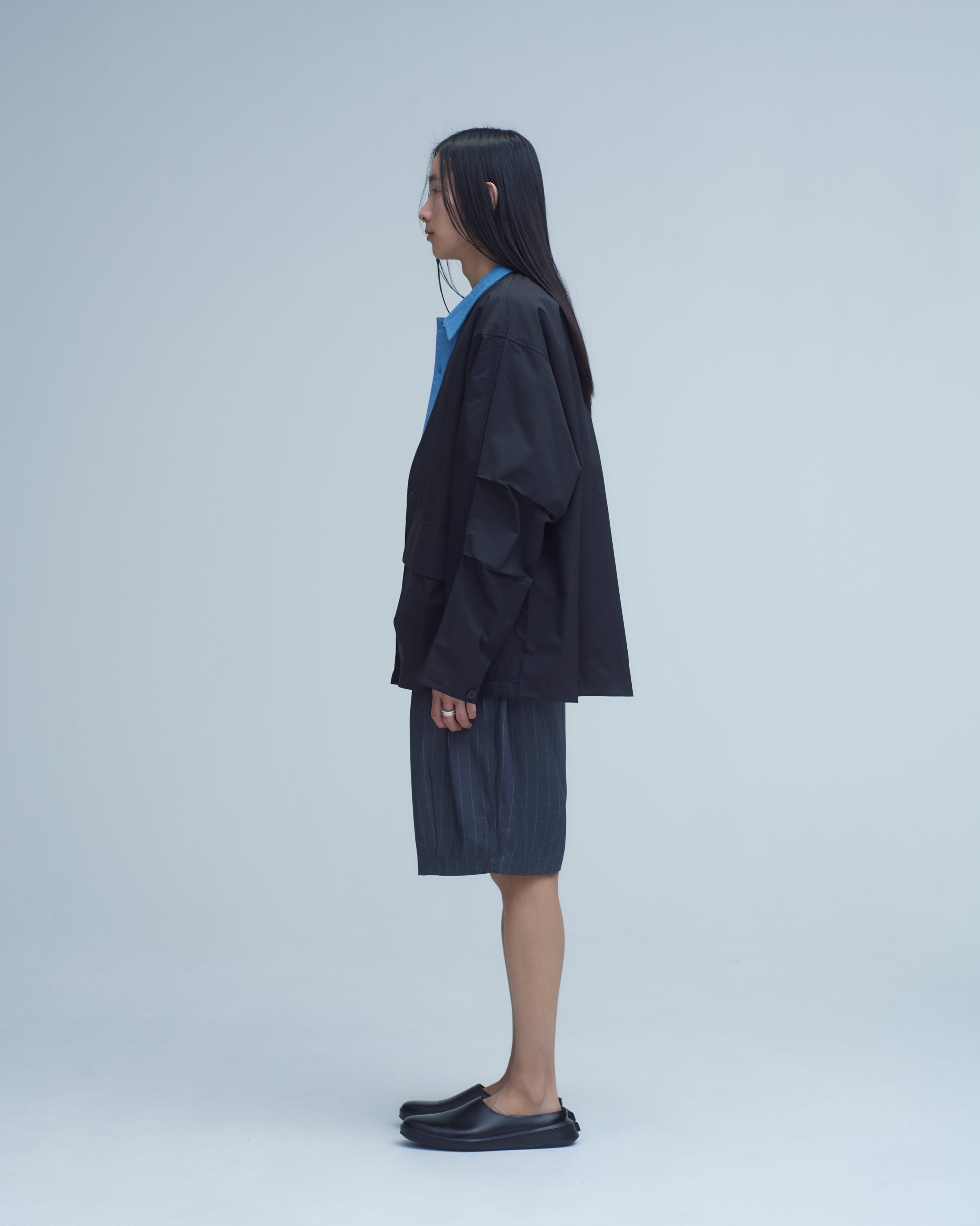 バルーンシルエットのスーツショーツ。フロントプリーツが前面にボリュームを生み出し、ヒップから膝にかけて丸みのある立体的なシルエットに。スーツ地の質感とドレープ感はそのままに、軽さを実現。4カラー展開、それぞれ異なる表情を持つ。